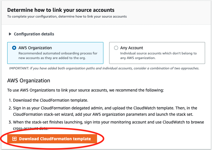 - Download the CloudFormation template used to link source accounts
