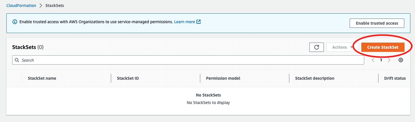 Sign in to the AWS management account and navigate to CloudFormation → StackSets → Create StackSet.