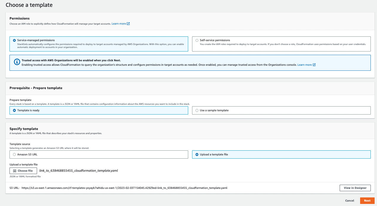 - Upload the CloudFormation template downloaded earlier