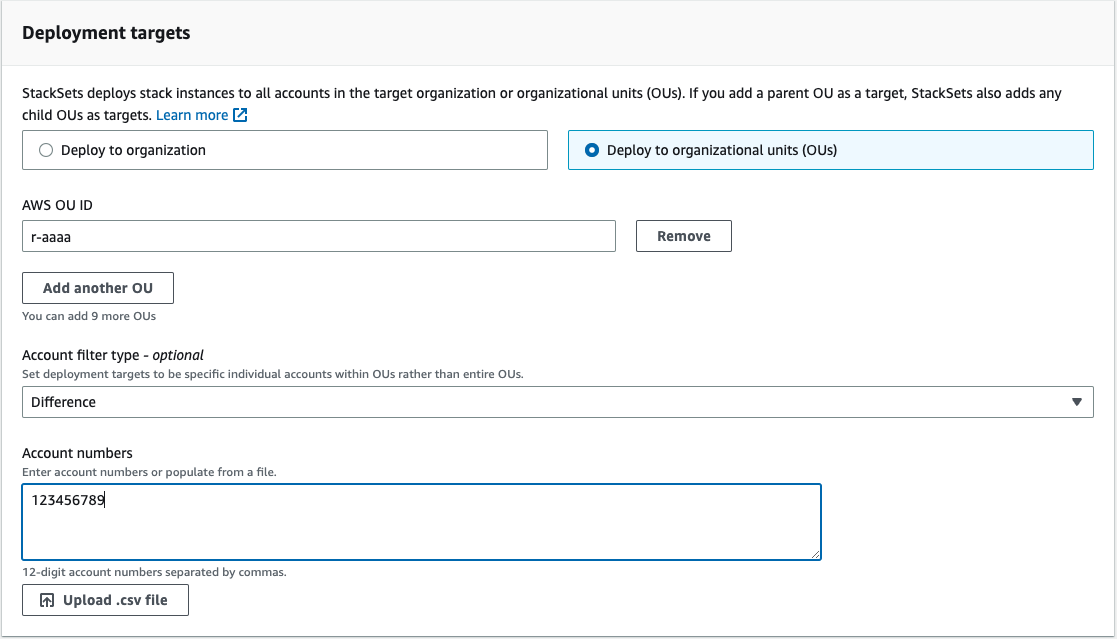 - Provide account IDs to exclude or upload a CSV file