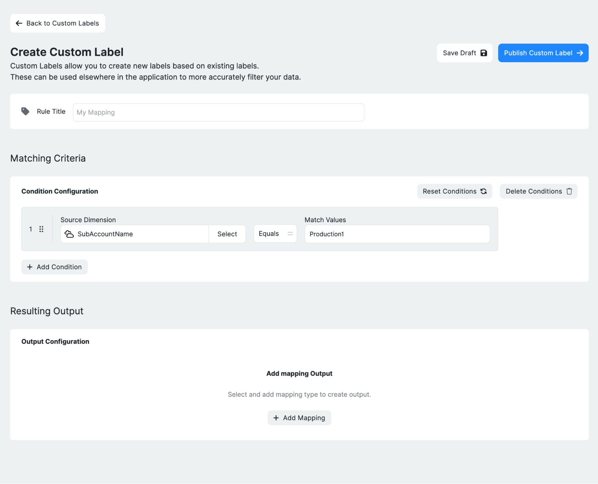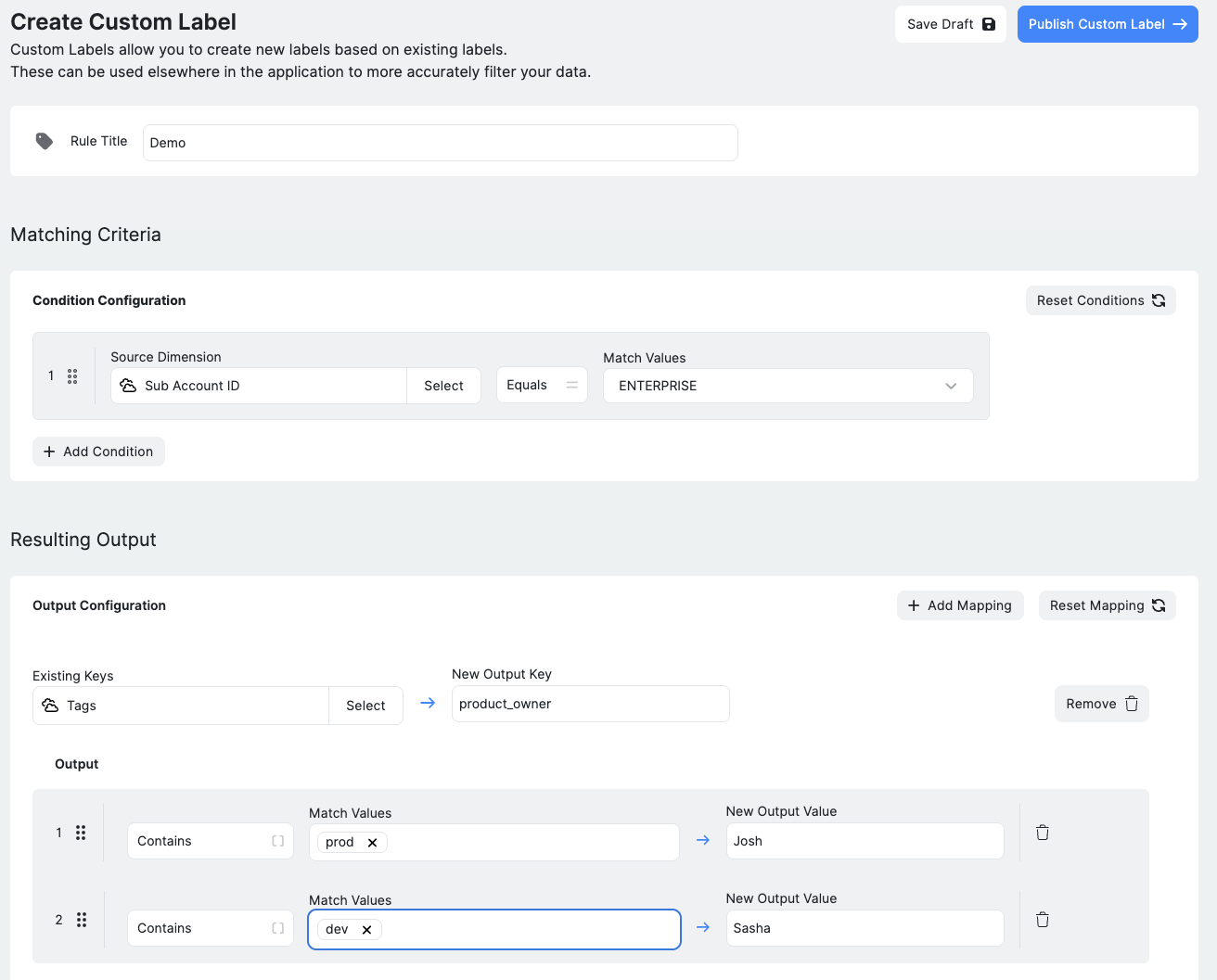 Custom Label rules can be saved as a draft before being made active. Saving as Draft allows the rule logic to be reviewed and refined without affecting billing data. Publishing activates the rule and applies it to eligible cost line items.