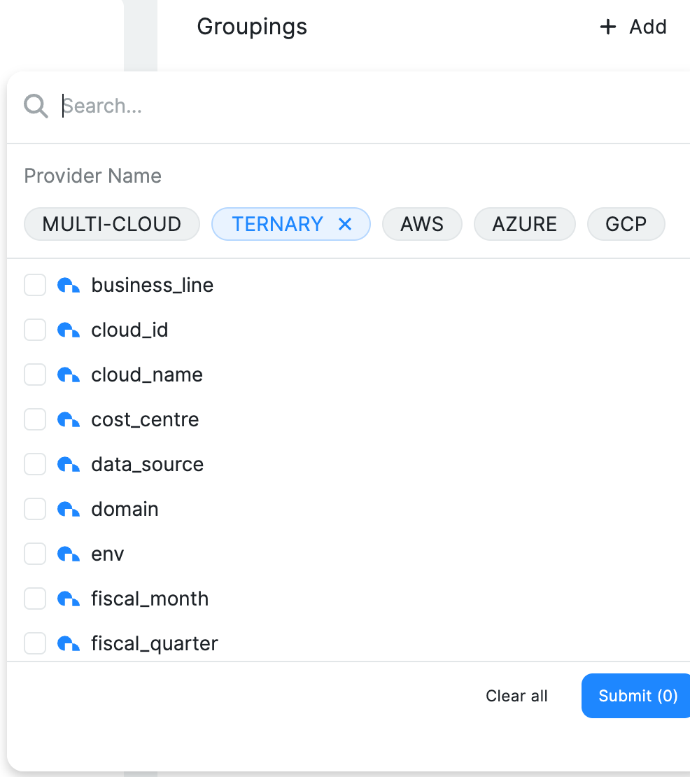 Custom Labels can be located by searching for the label name directly or by selecting the quick filter pill labeled Ternary, which displays all Custom Labels created within the tenant. This allows teams to immediately group, filter, and analyze cost data using newly defined business dimensions.