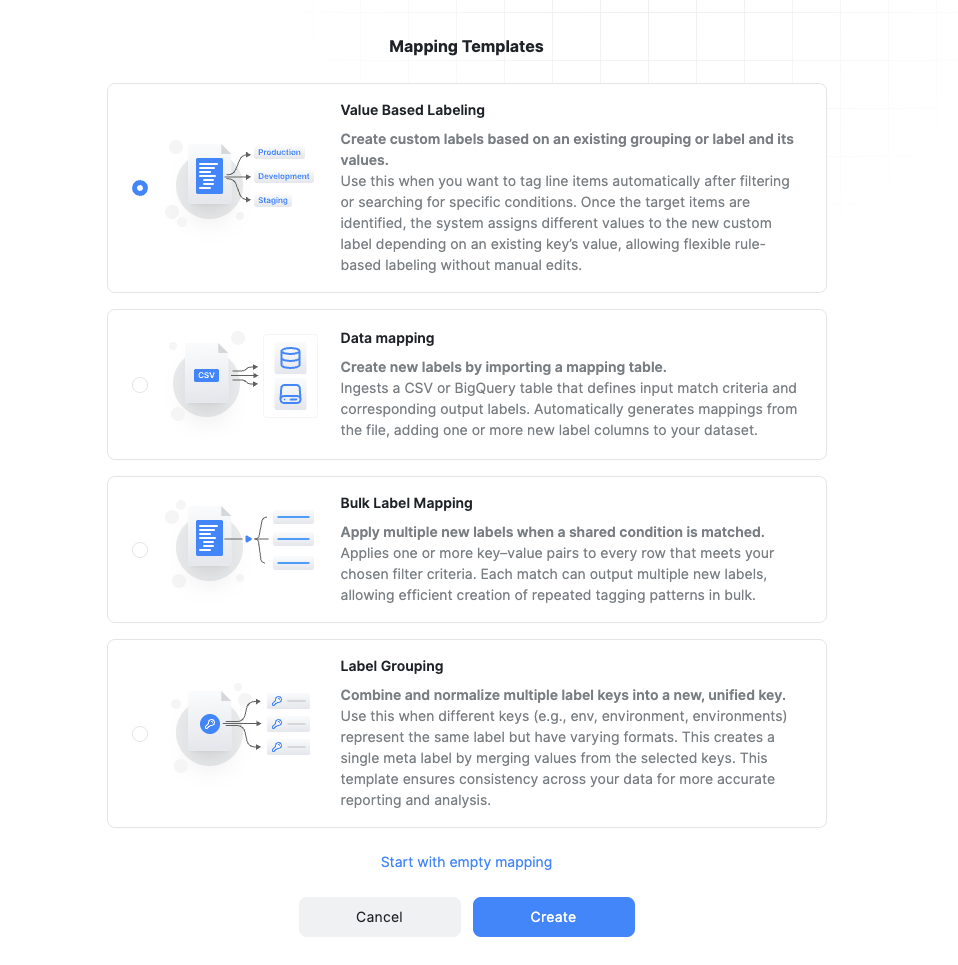 Data Mapping allows bulk creation of labels using a structured CSV file or a BigQuery table. To use Data Mapping: