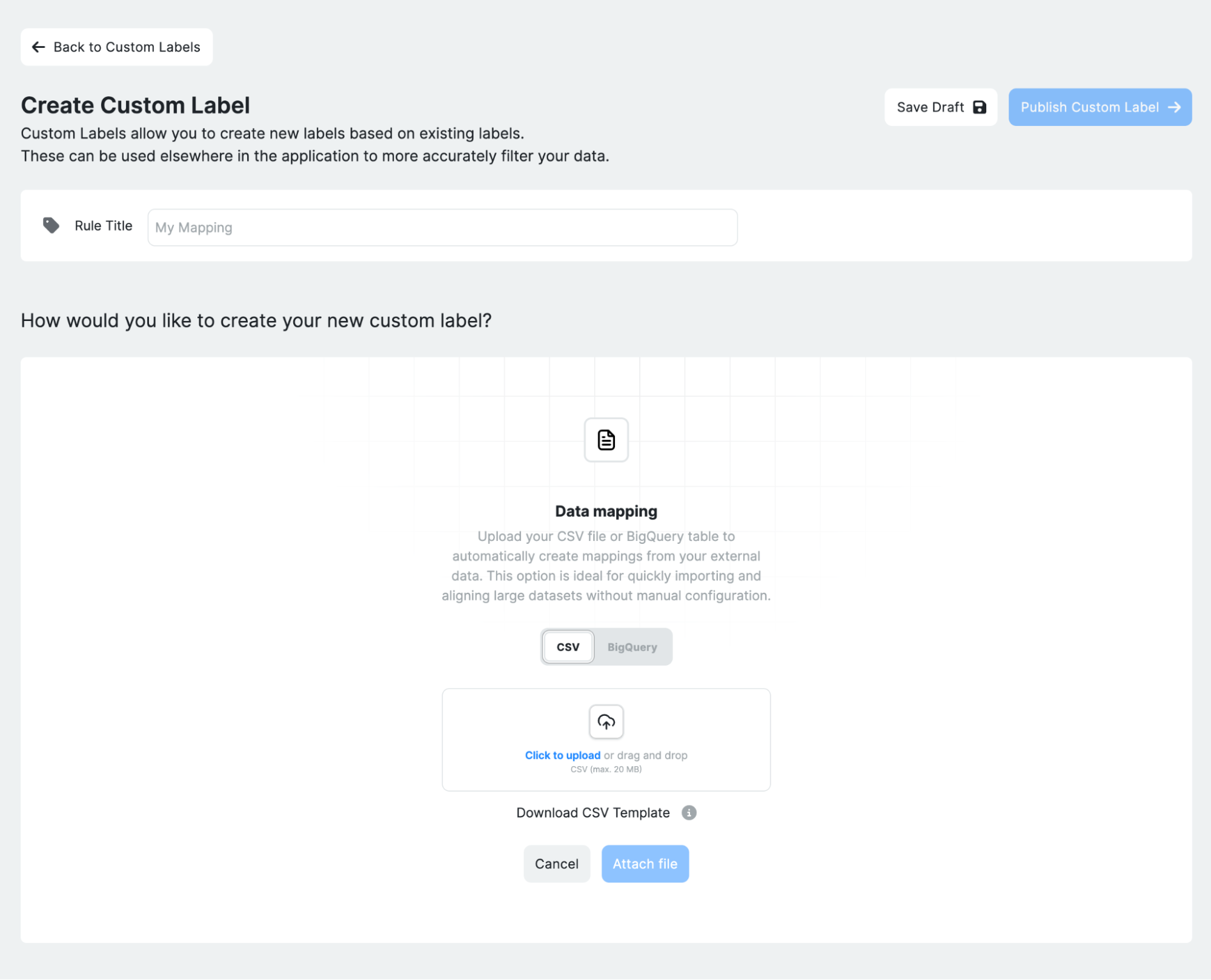 - Select either the CSV or BigQuery option in the Custom Labels workflow.
