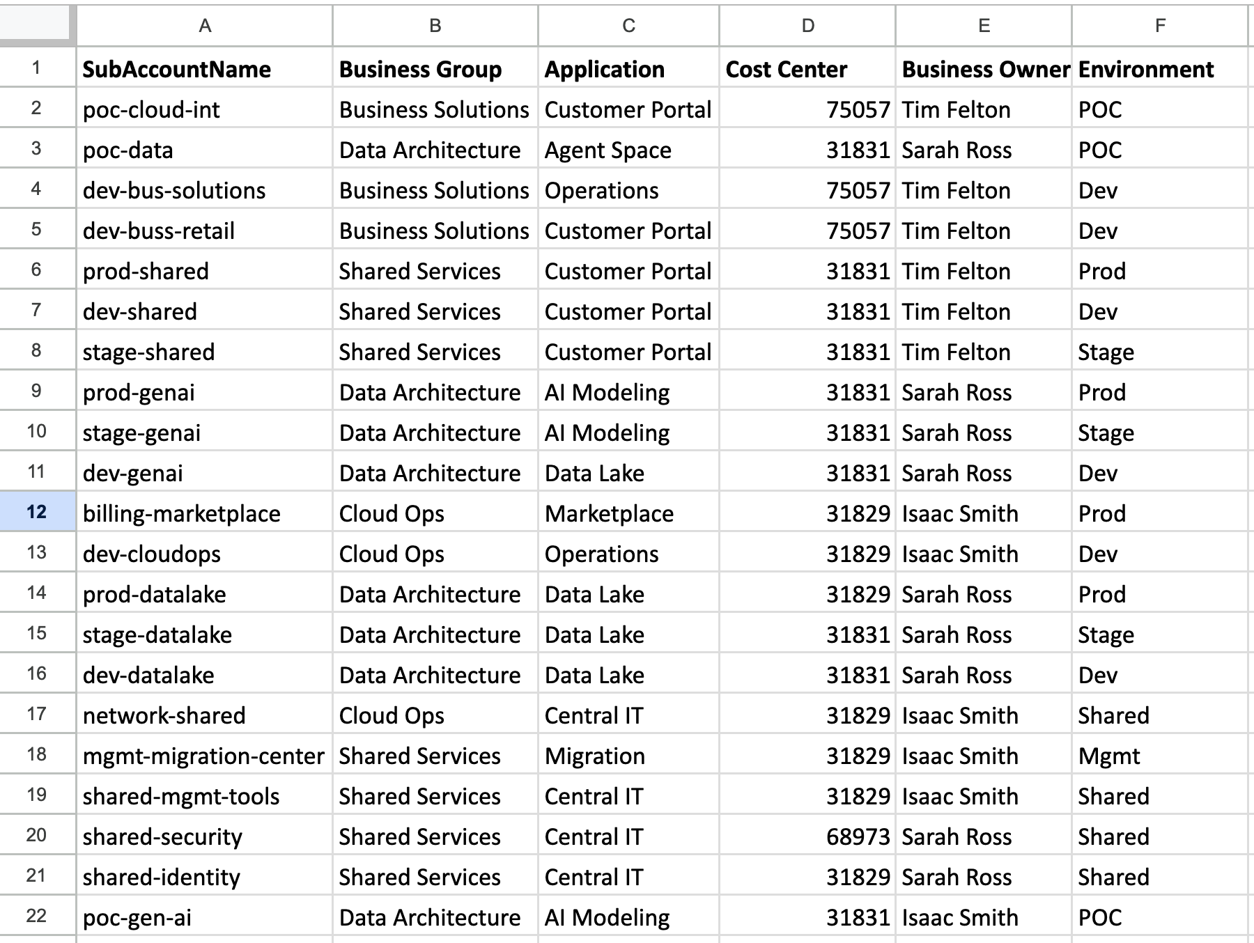 First column (required): Primary input key (e.g., AccountID, BillingAccountName).