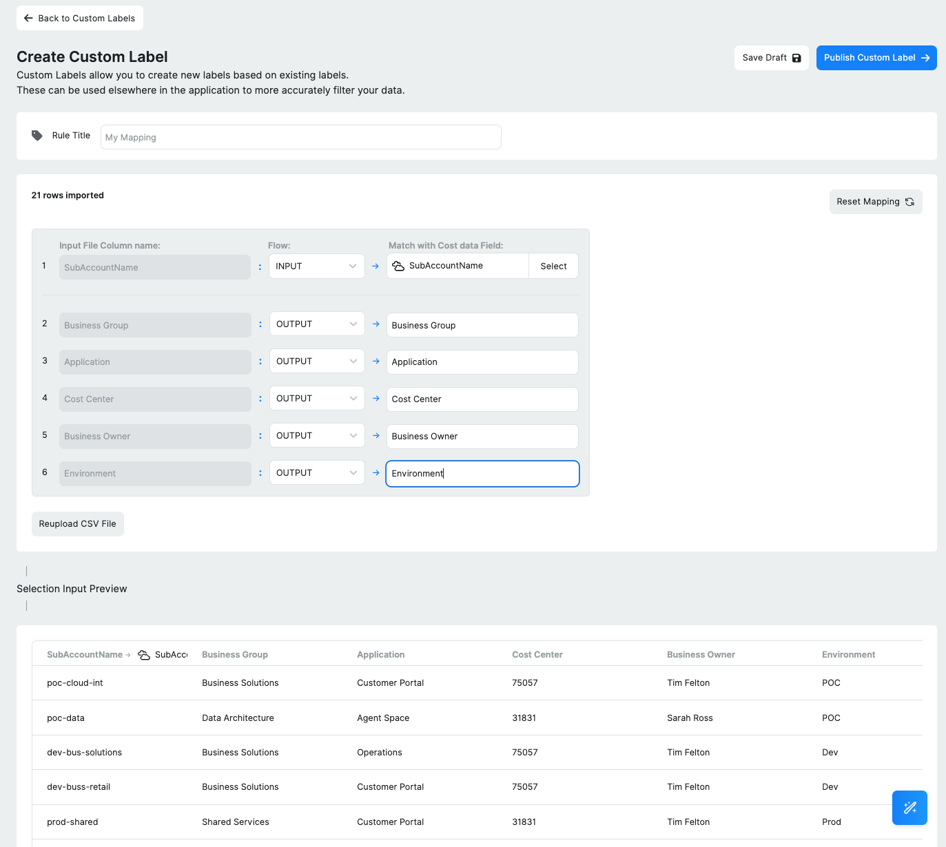 Once you click Attach file, you’ll move to the mapping preview page. This step allows you to tell the system which columns are inputs vs. outputs, and link input fields to cost dimensions in your billing data.