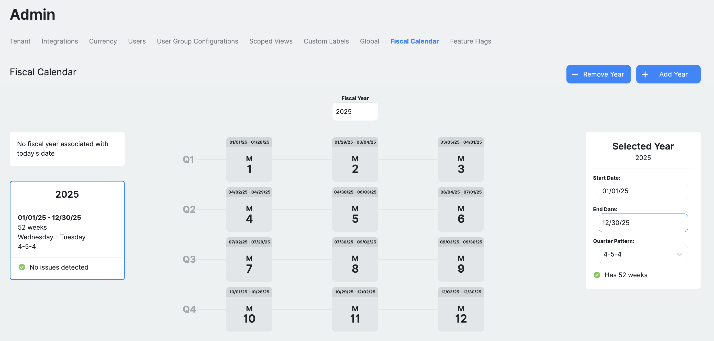 Once defined, you can add additional fiscal years and view derived values such as fiscal year, quarter, month, and week directly in the platform.