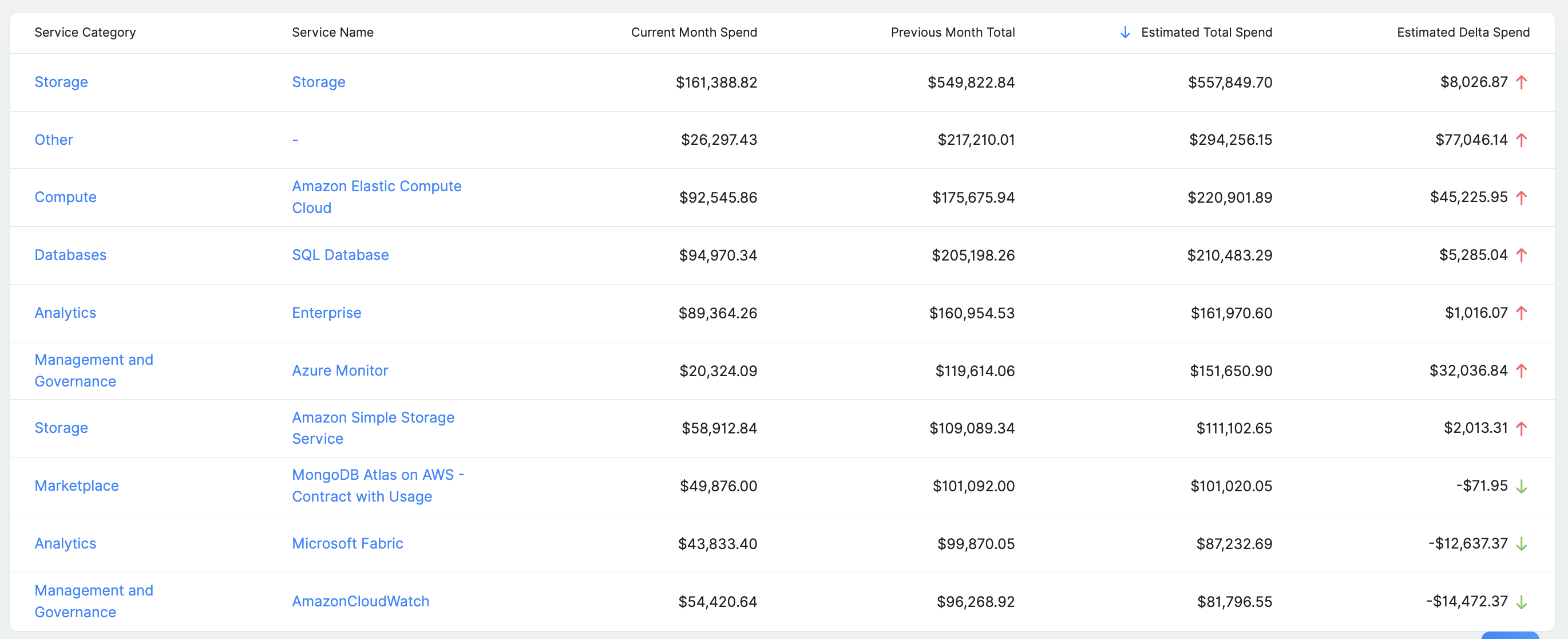The table below reflects the selected configuration and includes current spend, estimated total spend, and delta values, which can be exported as CSV for further analysis.