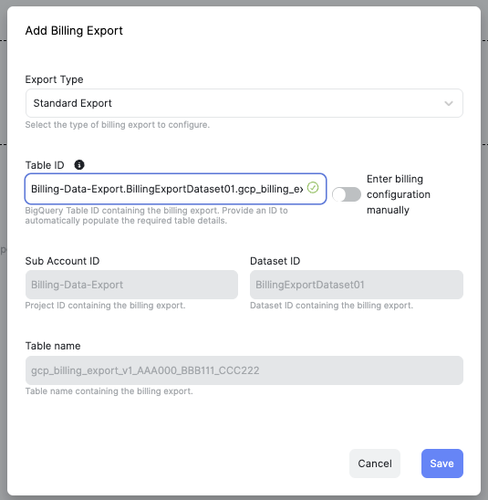 - Click “Add Billing Export.” From the “Export Type” dropdown, select “Standard Export.” Then enter the Project ID, Dataset ID, and Table name that were configured when enabling the BigQuery billing export.