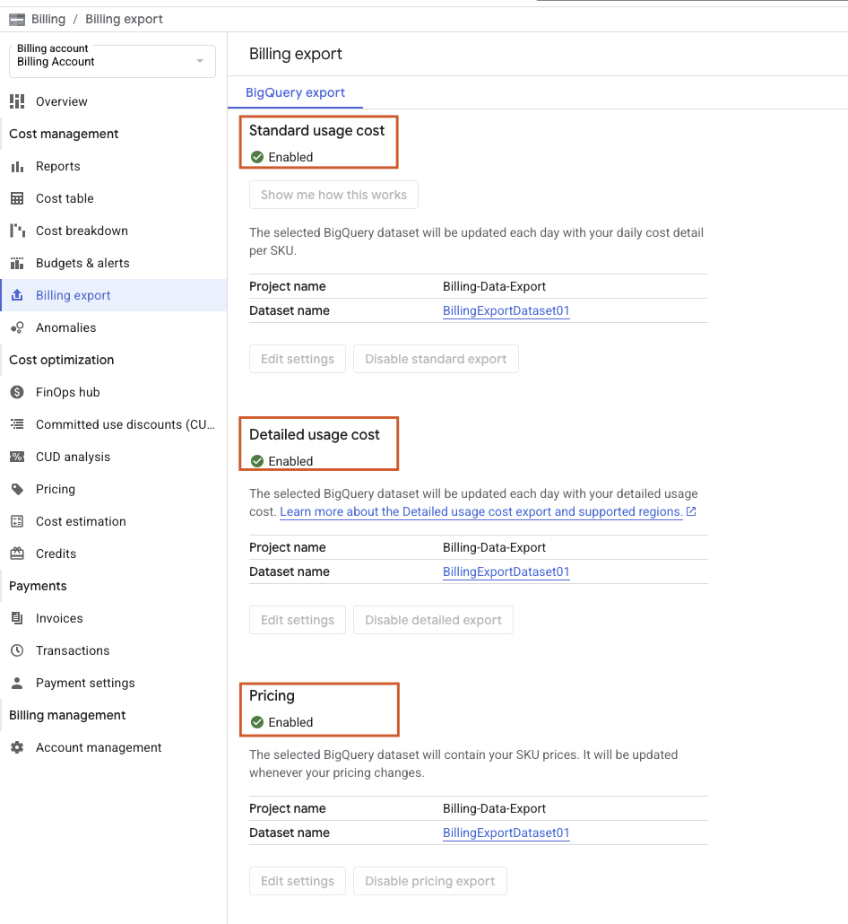 In the Billing → Billing Export page, enable the following exports: