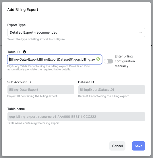 - Add the Detailed Export. Click “Add Billing Export,” then select “Detailed Export” from the Export Type dropdown. Enter the Project ID, Dataset ID, and Table name used when enabling the BigQuery billing export earlier. For the Table ID, use the underscored billing account ID, prefixed with gcp_billing_export_resource_v1_. Click Save.