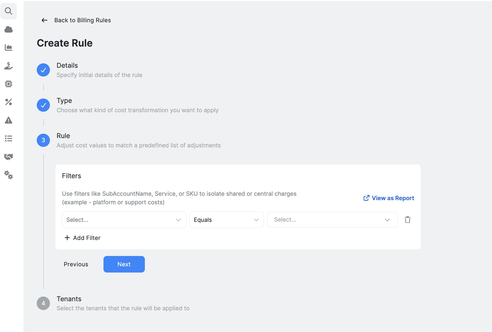 The MSP Billing Rules Engine enables MSPs to apply rule-based transformations to cloud billing data before it is surfaced to child tenants. It is used to adjust costs, credits, and margins so customer-facing billing reflects negotiated pricing, internal markups, exclusions, or standardized rates.