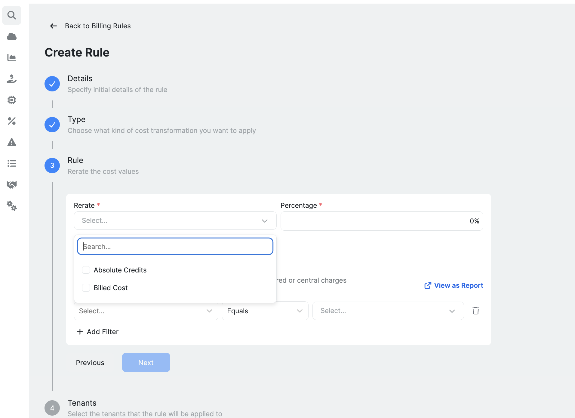 The Rerate rule adjusts billing amounts by applying a percentage offset to existing costs or credits. Unlike Adjust to List, this rule modifies values relative to their current base and does not reset pricing to cloud provider list rates.