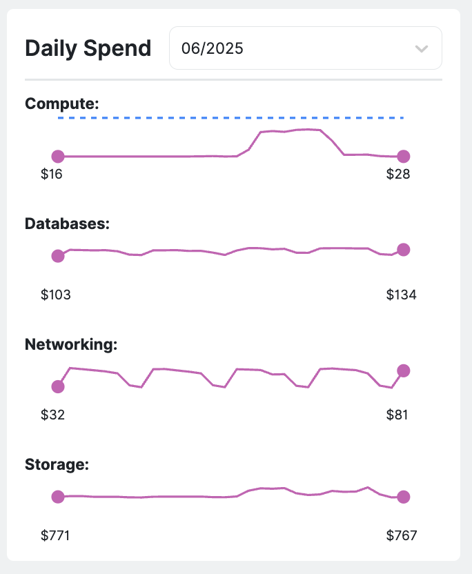 - The pink line shows actual daily spend. When the pink line consistently sits above the blue line, it indicates overspending for that category or service. When it stays below, spend is trending under the planned projection.
