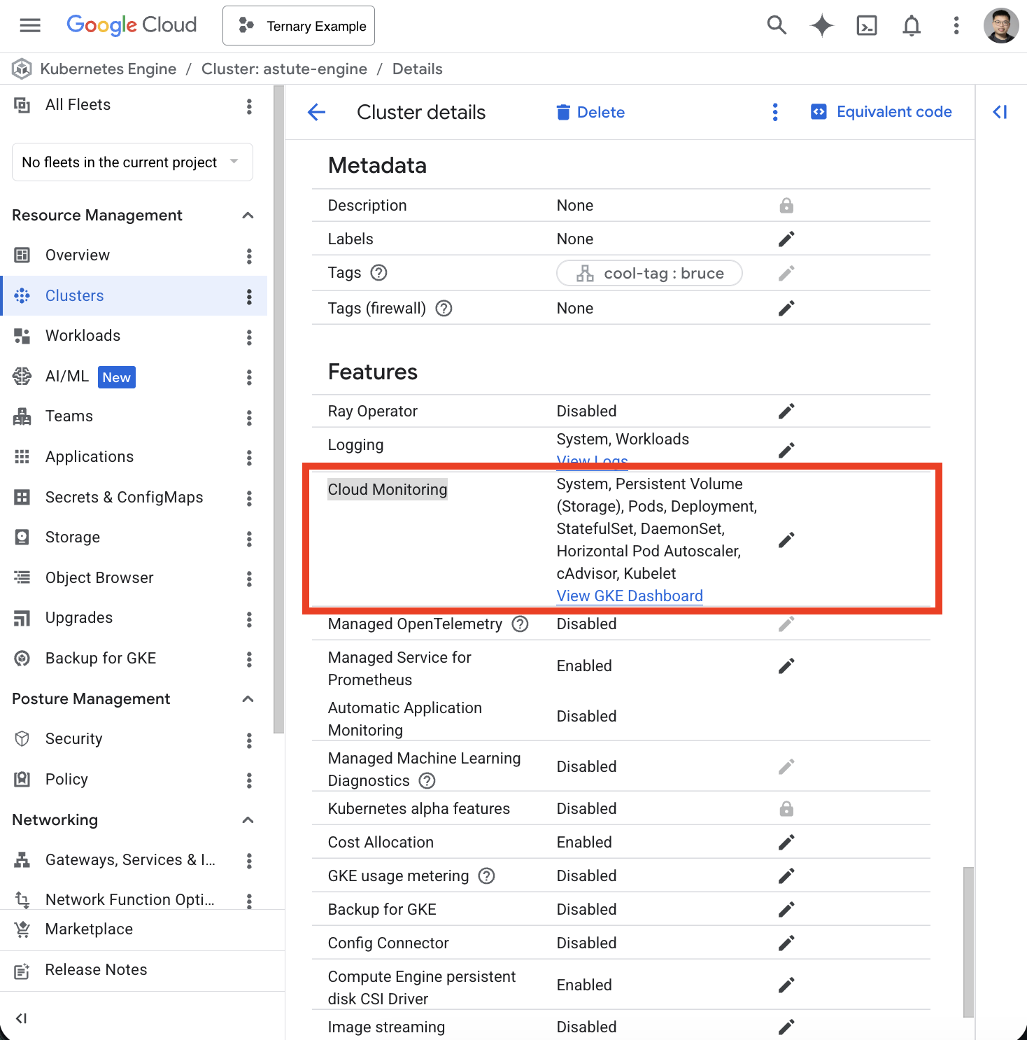 If Cloud Monitoring is not enabled, metrics for clusters, namespaces, workloads, and pods will not be available in Ternary.