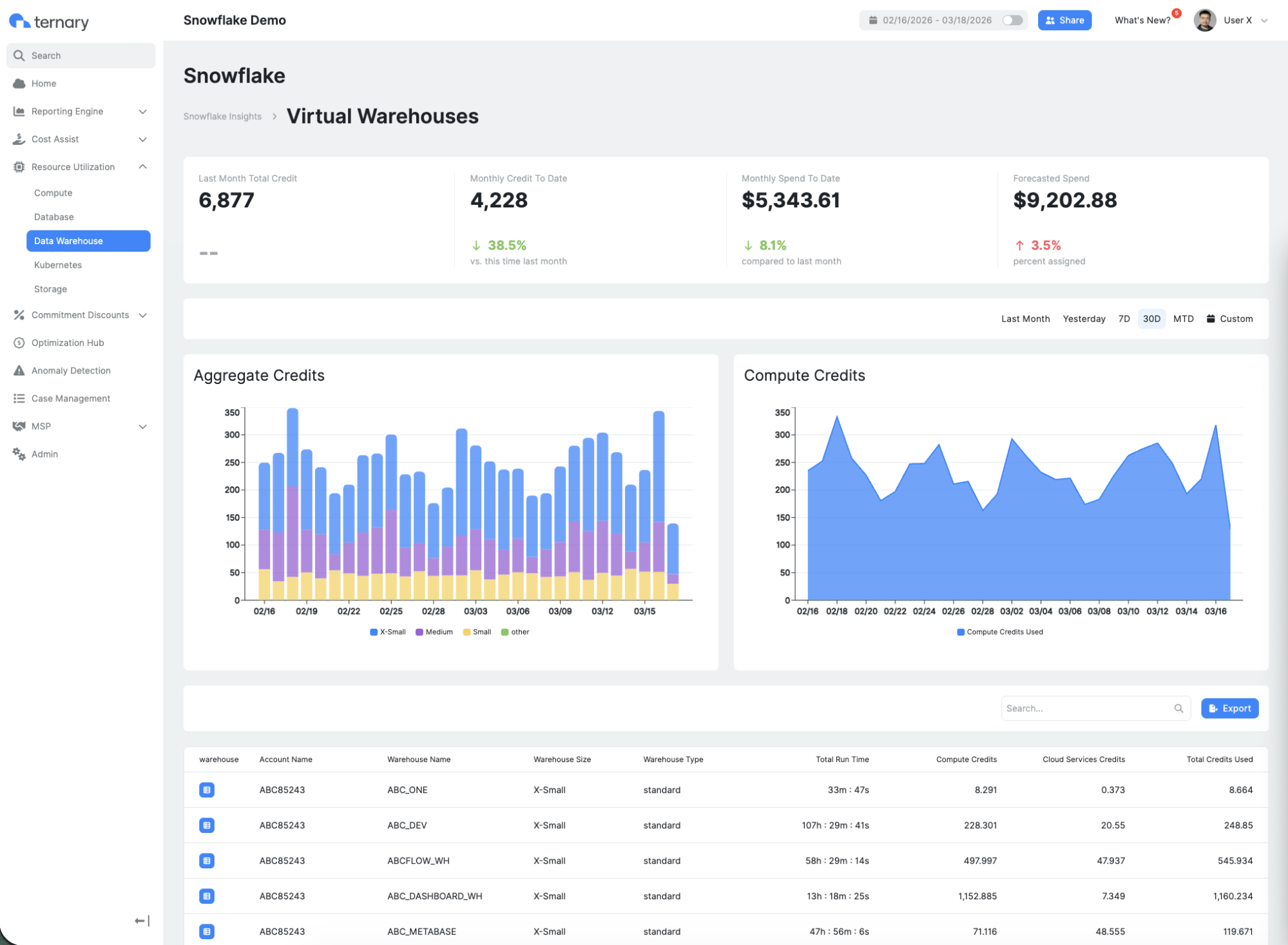 Once configured, Snowflake data becomes available across Ternary dashboards, the Reporting Engine, and the Data Warehouse and Database Insights views for cost analysis and usage monitoring.