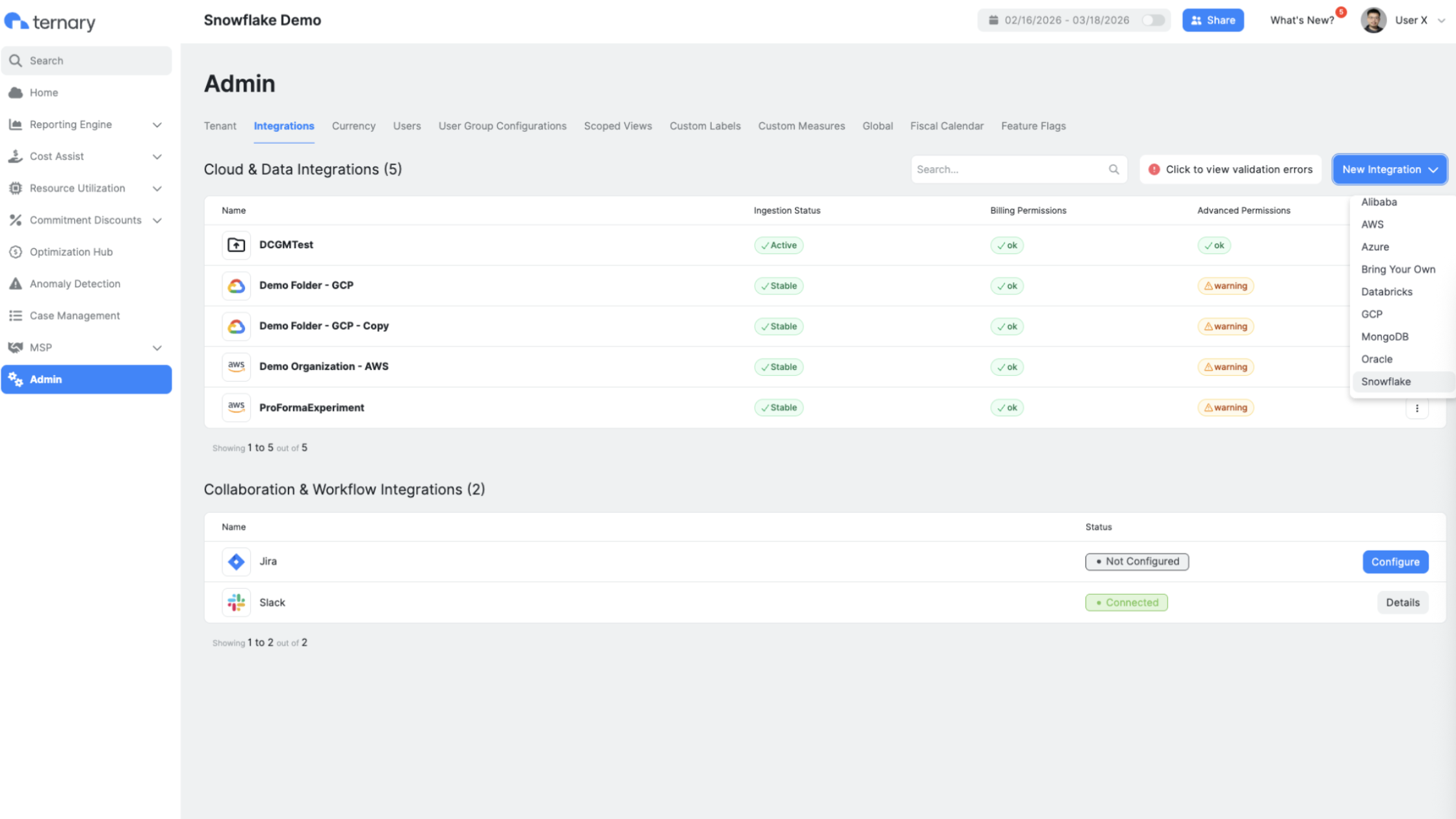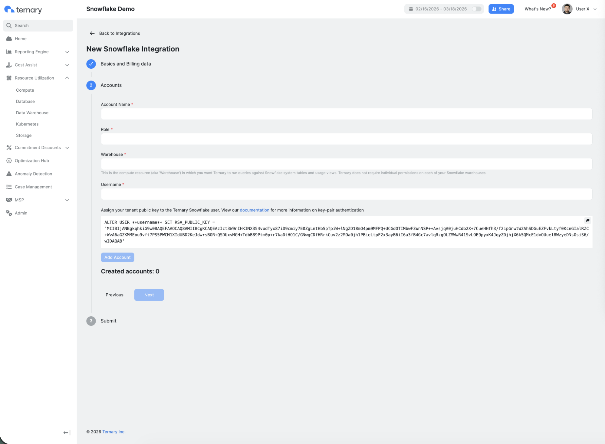 After gathering the required information, configure the Snowflake integration in Ternary.