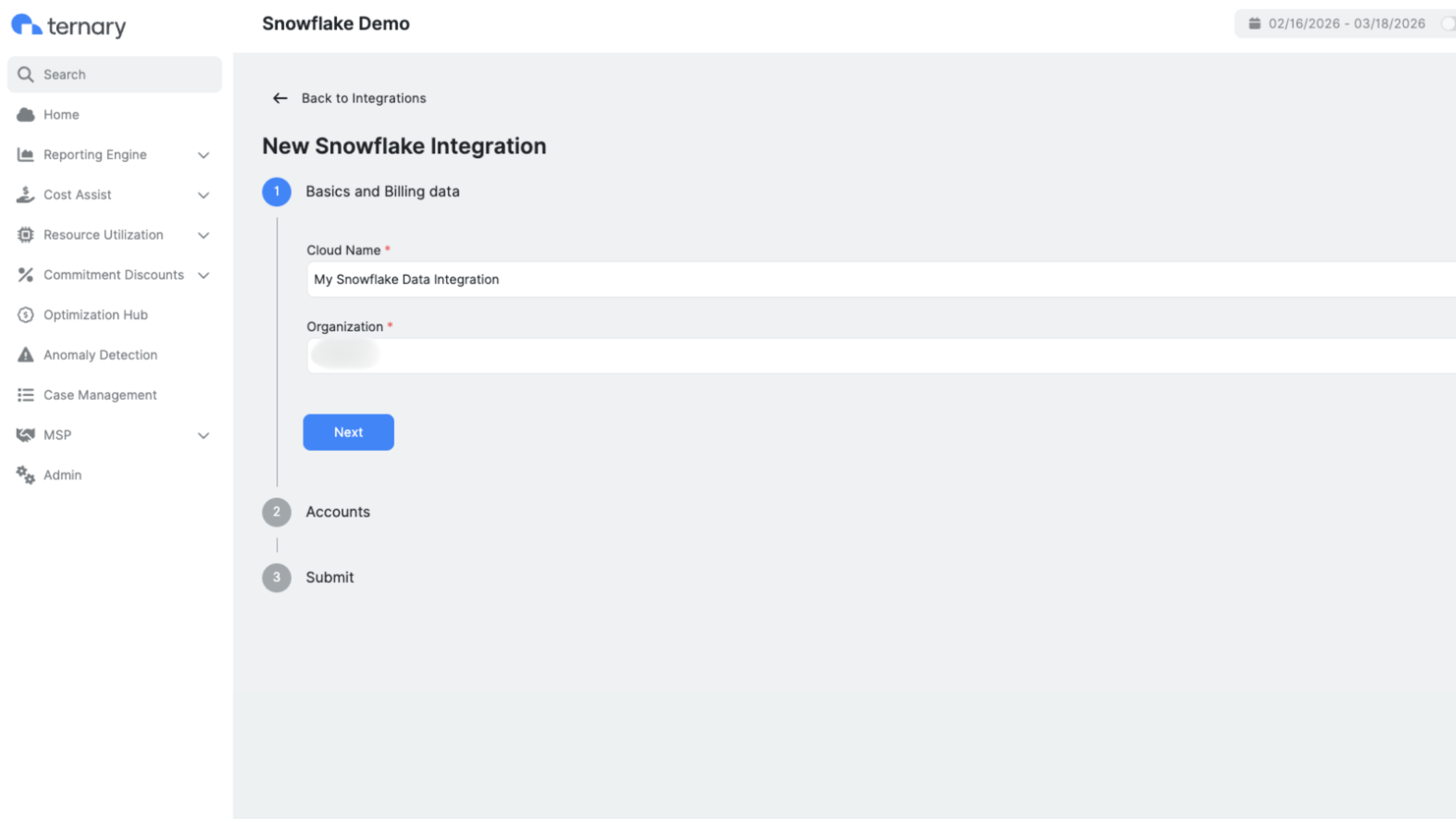 Enter the Cloud Name (display name for this data integration) and the Snowflake Organization Name (find your organization name here).