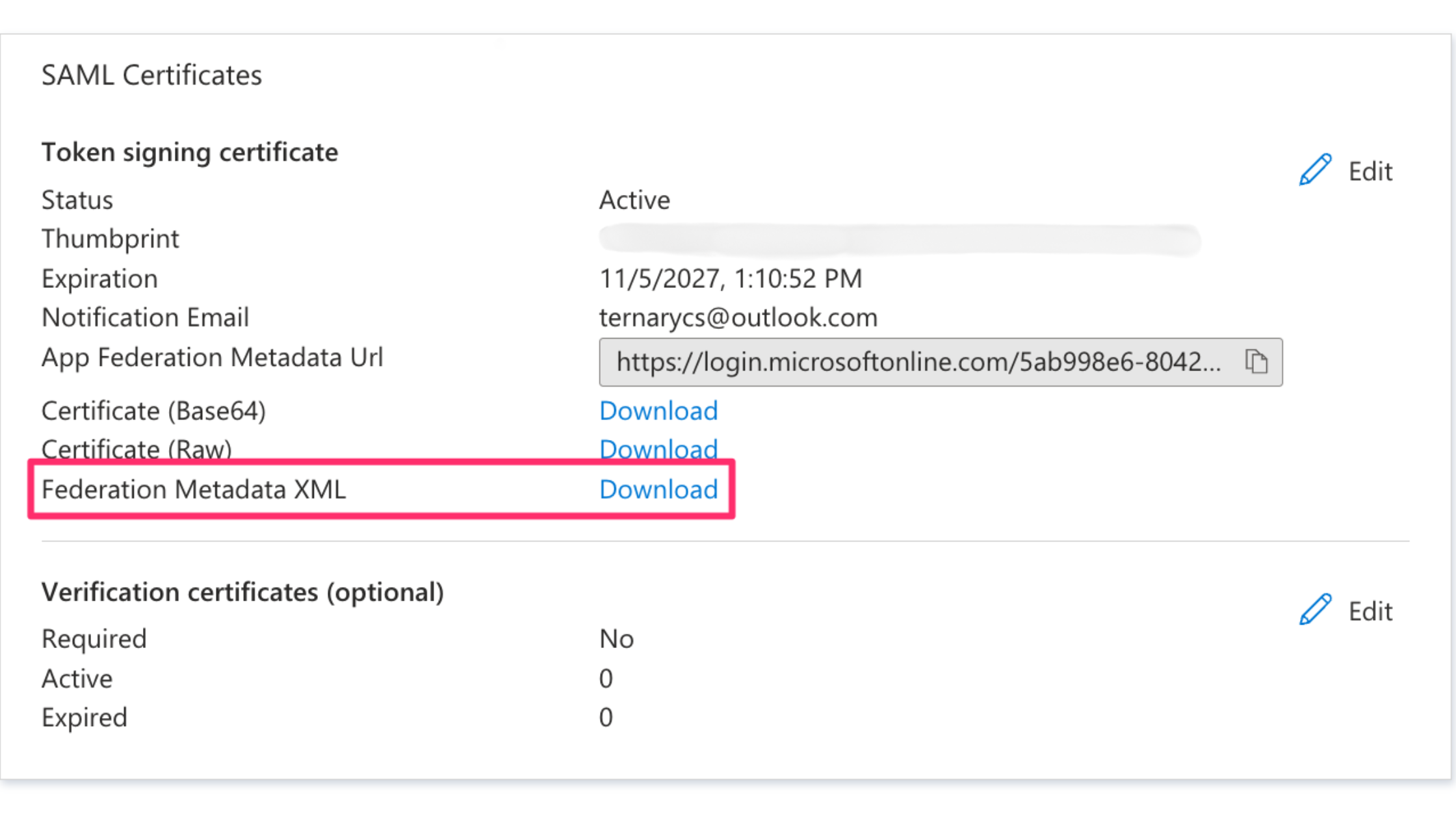 Finally, in the ‘SAML Certificates’ box, select the option to ‘Download the Federation Metadata XML’ and provide the downloaded file to your Ternary Success Manager